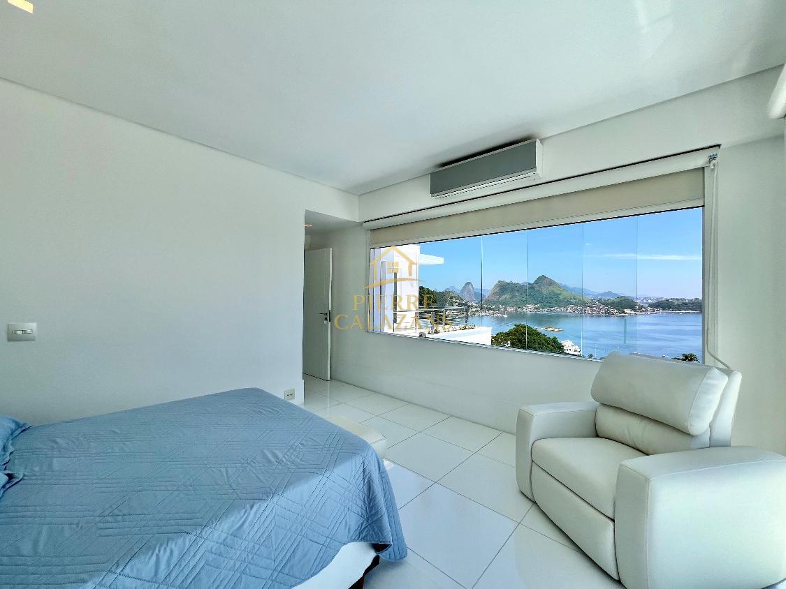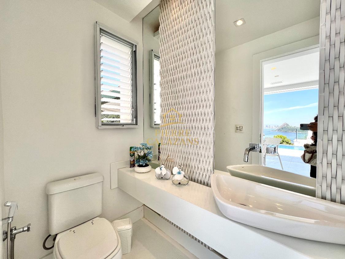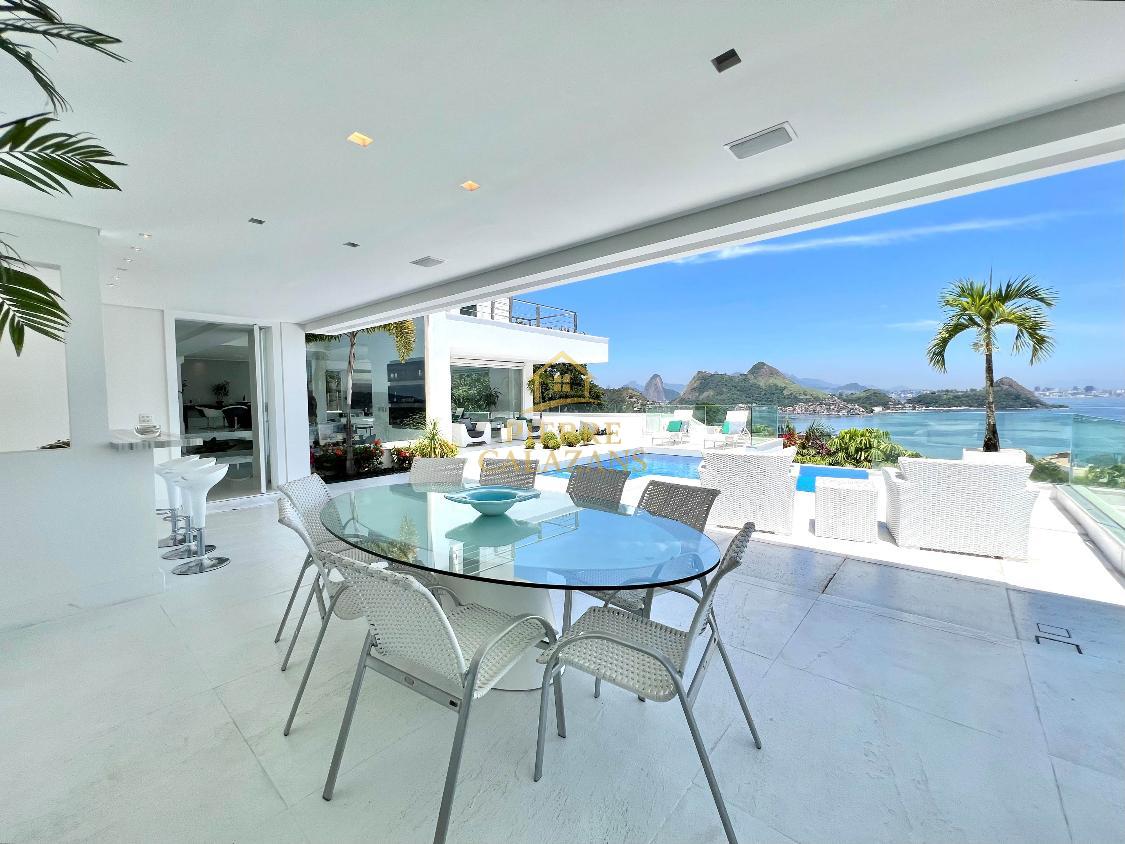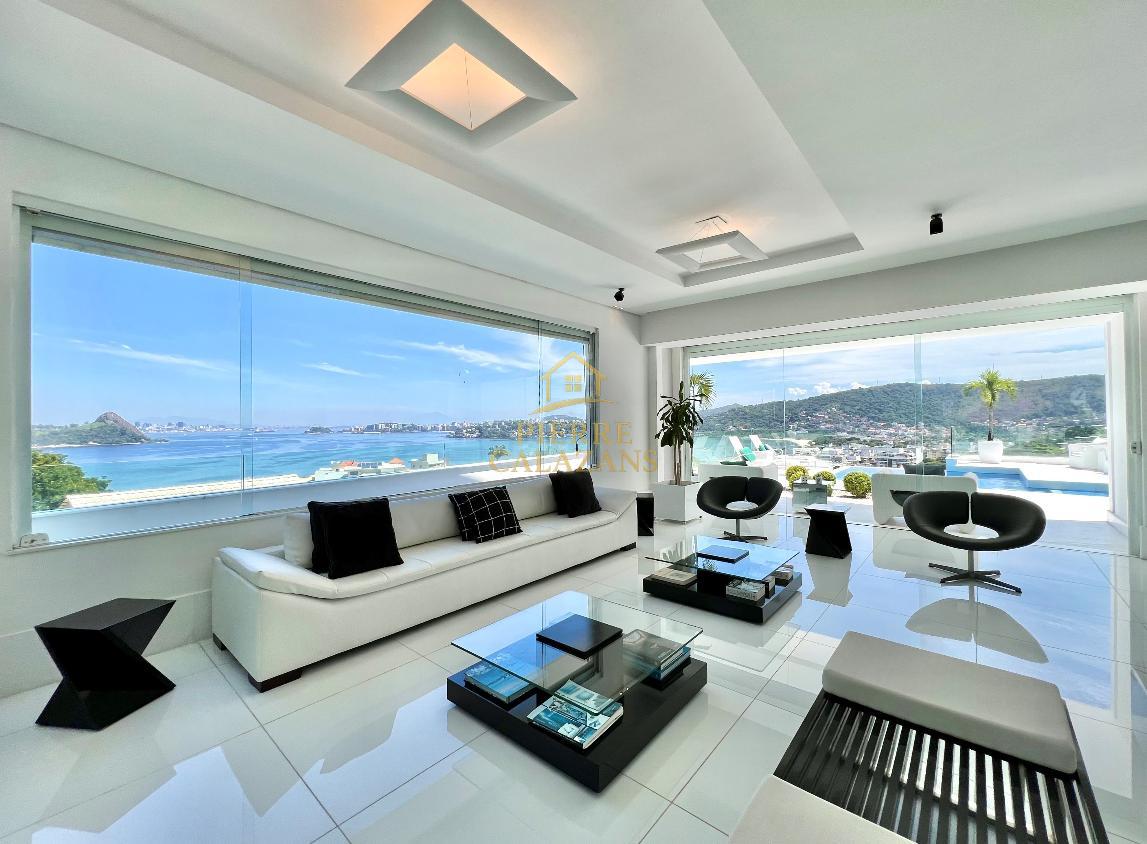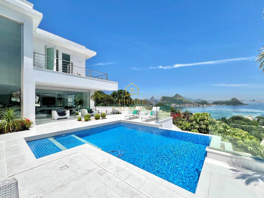 Casa deslumbrante no condomínio Aruã em Charitas! Vista eterna para o mar de todos os ambientes. As 4 suítes ficam no pavimento superior, sendo a master com varanda, closet e hidromassagem. Sala ampla em diversos ambientes como estar, jantar, tv e bar, com janelas panorâmicas, lavabo. Área de lazer com piscina com aquecimento, churrasqueira, cozinha, lavabo, sauna seca, área de descanso. Copa e cozinha, despensa, lavanderia, 2 dependências completas lado a lado. Quintal gramado no fundos com horta. Um dos pavimentos é um lounge com sala de tv , jogos e banheiro, mas com todo o recurso para ser transformado em um Loft apartado da casa. A casa possui área bunker/ blindada. Elevador hidráulico para 4 pessoas que atende todos os pavimentos. Gerador 30KVA a diesel Garagem coberta para 3 carros com portão eletrônico.